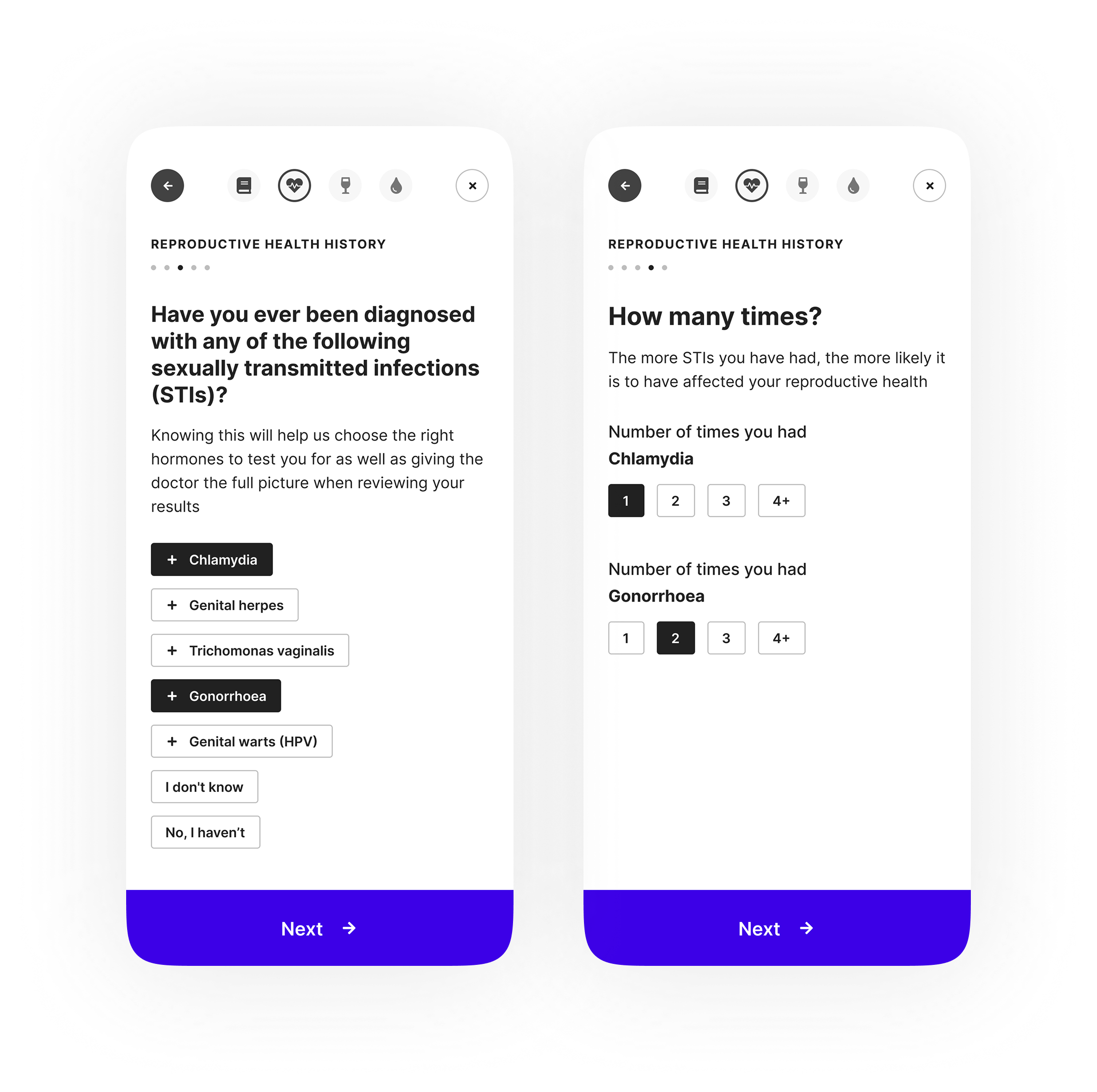 To support clinical accuracy and personalised care, Hertility’s mobile screening assessment needed to capture a wide range of reproductive, lifestyle, and symptom data, while still feeling calm, supportive, and easy to complete.
